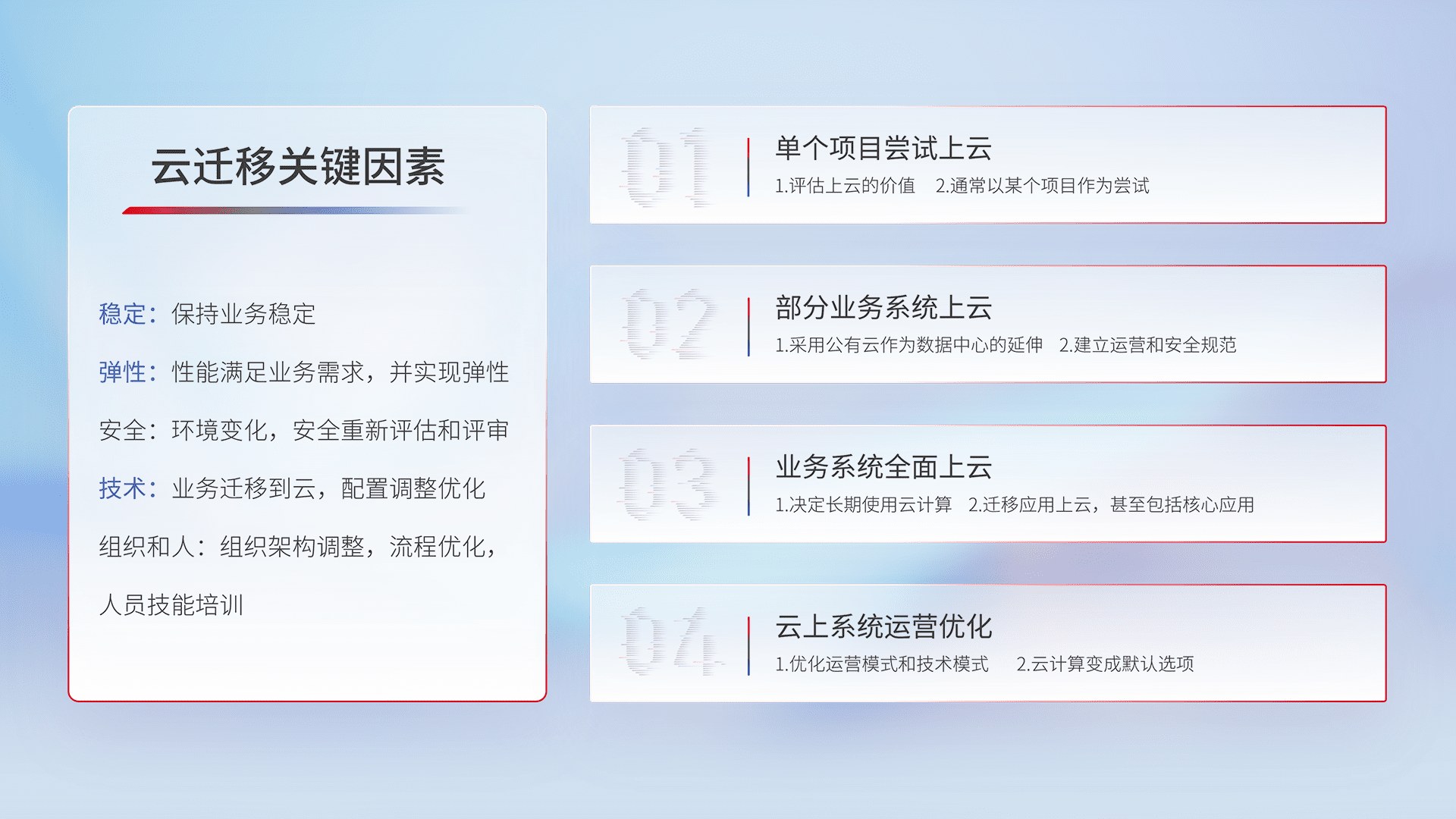 结合实际业务,,,,从规划设计、、云平台选型、、、、云原生改造、、数据迁移、、集成交付,,,迁移全过程为客户识别最佳上云路径,,,,做好风险识别管理,,设计网络架构、、身份权限、、、安全审计合规、、、操作审计、、、、日志审计、、监控告警策略、、、多站点容灾设计等,,,,对云上基础设施进行整体规划,,,,提升IT治理水平,,以满足弹性、、高可用、、高性能的需求。。