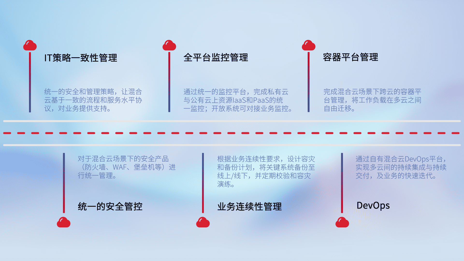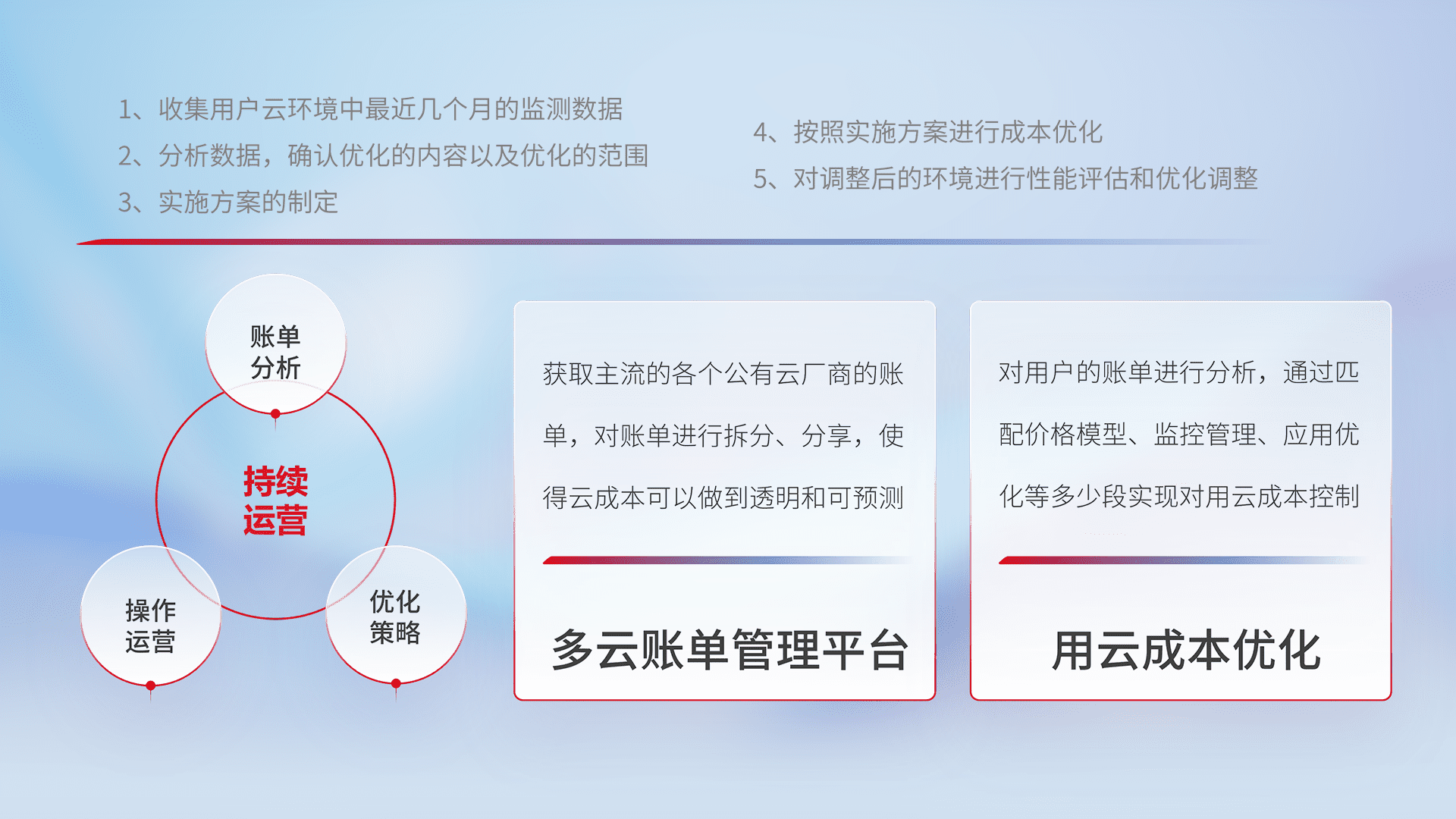 通过多云纳管,,以统一的资源数据模型把客户的云资源进行抽象和封装,,,进而实现对多云资源的统一操作,,保障云资源管理的可靠性、、稳定性与可用性。。量身定制化运维内容,,,配置、、开发运维、、、补丁管理、、备份、、监控、、、、认证和访问管理、、审计和日常巡检等,,保障在用云过程中的可靠度,,,,稳定度以及高可用率。。