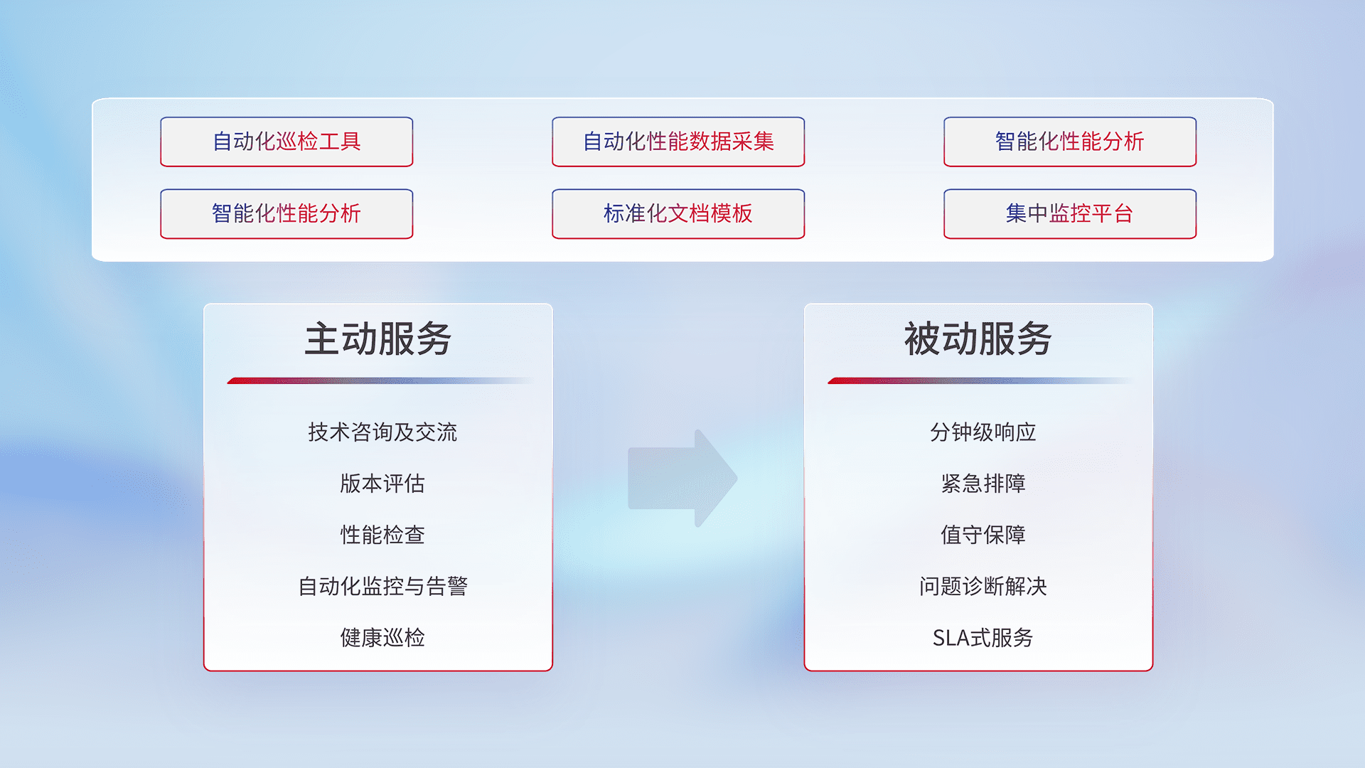 智能化工具和标准化文档,,,保障服务质量,,,提供主动服务(包含技术咨询、、、版本评估、、、性能检查、、、、自动化监控与告警、、健康巡检)和被动服务包含(分钟级响应、、、紧急排障、、值守保障、、问题诊断解决、、、SLA服务)。。。